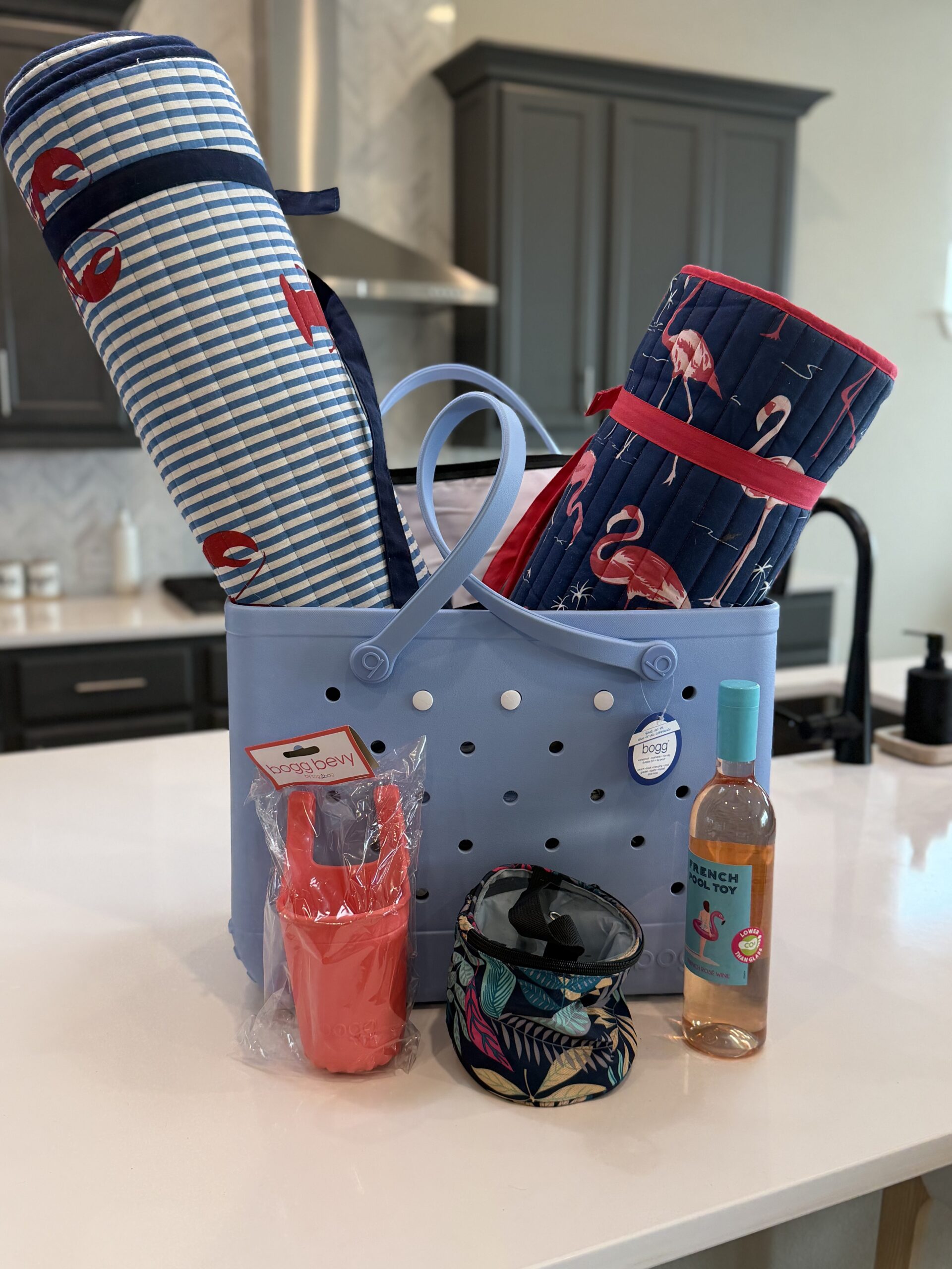 Blue Insulated BOGG Bag, 2 Beach blankets/mat, insulated drink cooler, White Wine in plastic bottle for beach and pool safety!